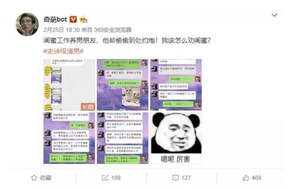 3、bot的运营模式 bot账号往往会先确定一个明确的主题,这个主题一般会直接体现在账号名称上。 bot账号取名基本都遵循“XX+bot”的模板。 例如: “冷知识bot”、“糗事bot”,这里的“冷知识”、“糗事”就是主题。 确定账号主题之后,就要关心内容的问题了。 bot账号基本不会自己原创内容,其内容来源主要依靠用户投稿,而运营者主要负责对用户内容进行把关审核与质量筛选,然后发布在自己的账号上。 总体来说,因为不需要原创内容,bot账号的运营门槛还是很低的,只不过日常处理大量粉丝投稿等工作略显繁琐。 4、为什么要关注bot? bot的历史在中国并不长,尚在起步阶段,在发展过程中会不断呈现新特点,新内容。 比如: bot账号具备垂直细分、高度依赖用户的特性,这些特点都是作为普通运营者,绞尽脑汁想要达到的效果。 因此,关注bot模式的发展,研究其内在规律,一方面能让我们了解到新兴的互联网事物,更重要的是能将其发反哺到我们日常的运营工作之中。 2 bot的类型 bot的主题类型非常丰富,随便一个话题拿出来都可以运营一个bot账号。 根据我对微博上目前bot账号的观察,主要有下面几种类型: 1、沙雕欢乐向bot 都说微博上沙雕网友欢乐多,沙雕文化在微博平台的确很受欢迎,自然会有相关的bot账号出现。 比如: @天秀bot 就致力于发布各种沙雕、搞笑类的视频和图片,最近发布的一条视频#为科目二操碎心的教练#还直接上了微博热搜。 @奇葩bot 发布的内容多为来自粉丝投稿的奇葩经历。