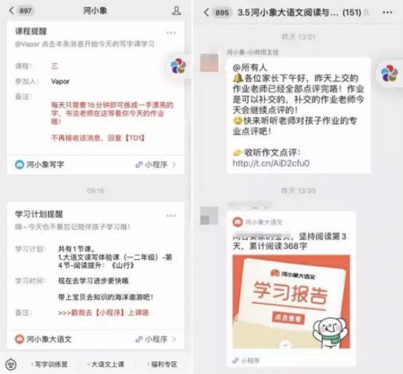 小程序与服务号打通,每日服务号模板消息也会推送提醒你学习打卡的消息。所以河小象的运营重心就是两个字:督学。 尽可能的确保你能在这个学习中,完成学习与体验完他们的服务,就和传统教育常见的听完试听课,才能转正价课的套路一样,只有你体验完了课程,觉得课程对自己对孩子有帮助,才会去购买正价课。