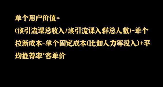 个人认为是单个用户价值。 如果公司不想烧钱,单个用户价值就决定了这个引流课的获客成本,是算ROI的一个重要指标。如果你的单个用户价值是150,想ROI成正比,那么在外部的推广成本就不能高于150一个人。