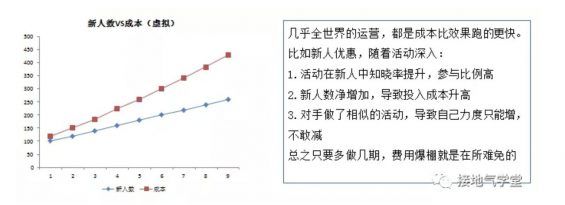 痛点3:有效果,但领导要求越来越多 比如新用户注册消费很少,于是决定做一个“新人注册后,首单立减10元”活动。做完了效果而很好,新人注册后首单率迅速上升,结果领导又不满意了: “首单有了,二次消费好像又不行了” “二次消费有了,都是小单,GMV上不去” “反正都投了这么多资源了,要毕其功于一役!” “你再多想想,要掌握底层逻辑,核心思维,不要光砸钱” 每一个做过活动/用户运营的看到这里都两行泪直流。总之,作为消费者,我们看到的那些跟奥数一样,“先订金后膨胀单品封顶组合裂变提现”,整都整不明白规则的活动,都是这么被逼出来的…… 痛点4:有效果,但领导说“不能一条腿走路” 终于,活动见效了!然而领导又不满意了: 你看新人都靠这个活动,没有活动了咋办 你看人家PDD都有新玩法了,我们不能这么因循守旧 你看《震惊!阿里最新技术解密》文章没?咱为啥不搞一个 总之只有一种形式是不行的,继续创新。创新吗,又要看数据、做测算、分析需求、设计规则、测试效果、效果不好继续纠结:该怎么创新。 痛点5:有效果,但现在又没钱了…… 活动效果很好,人数一直涨,结果现在新人数太多了,费用扛不住了(如下图),于是领导又提出:搞些创新点子,不要总用旧套路,成本都撑不住了。
