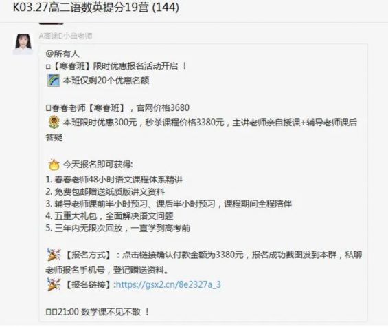 在每天的课程结束后,群主会在群内推送限时优惠报名信息。高途采用的转化政策是: 01. 限时限额,利用电商的传统的抢购套路,错过就没有的稀缺性,减少用户的决策时间,让用户快速成交。(限额基本也是说过用户看的,内部肯定是需要报的人越多越好)。但是基本一个群限额20名,客单价比较高的课程,在他们144个人的群内,也是达不到的。 02. 秒杀价,比官网原价课程便宜300元,最简单也最有用的优惠政策就是直接降价。 03. 额外福利,分别为送其他课程的体系精讲、纸质资料、预习复习服务、语文大礼包、无限次回放,从额外福利上来看这些东西,在很多公司都是作为正价课程宣传的点,基本就是正常报名正价课都会有的东西,高途应该也不例外,所以也算是一个正常的营销套路。因为高途课程体系的全面,所以其中两个礼品都是语文科目的奖品,也起到了课程联动,方便后期扩科。 04.赠送高一全年课程:这个也是高途最爆炸的一个营销政策,报高二一科的课程,直接赠送高一一科的全年课程,包括全部资料和全年复习规划。也算是其他机构常做的买一年送一年,只不过高途取了一个巧,赠送去年的课程,就不会影响后面,续费高三的课程。