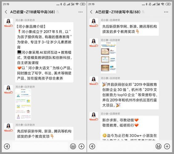 到了晚上6点,开班典礼正式开始,运营人员会分步骤向群内推送开班典礼的SOP话术。 首先,运营人员会向家长介绍河小象的机构品牌,以及所获得的各项荣誉,初步树立起河小象在语文教育领域的权威形象。