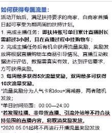 而对于像罗永浩、王祖蓝、兔子牙这类直播顶流来说,直播推荐的流量占比能够达到40%以上。 那么应该怎么提高直播推荐的流量占比呢? 直播需要“养号”吗? 首先,你要拿到直播推荐的入场券,即满足直播推荐算法的要求,让算法认识你。这样系统才会把你的直播推荐给用户。 如何让算法认识呢? 养号破冰! 养号?是的,你没看错。短视频养号已经被多方权威共同辟谣了,而直播,真的需要养号。 因为直播内容不同于短视频内容,直播是“活的”不是“死的”,是长时间连续性的,内容也是实时在变的。 因此,在直播冷启动的过程中,算法想根据你的内容进行个性化推荐是非常困难的,所以在直播前期,需要做一些帮助算法更好的认识你的事情,这个过程,就是直播的养号过程,也是直播推荐流量破冰的过程。很多内容创作转型直播的小伙伴都是死在了这个养号的过程之中。 如何养号?其实抖音官方已经说的很透彻了,看图 开过直播的应该都清楚,这个是抖音官方新手任务,任务里面强调了3个维度, 直播时长:0.5-5.5小时; 音浪:互动及收入; 开播频率:2次/周或4次/周。 这个任务不仅仅是鼓励用户做直播,加强直播频次、时长,其实也是告诉你进入直播推荐流量池的门槛。 第一、 保证单场直播时长 新手任务中的最低门槛是0.5小时的单场直播时长。而实际上,抖音官方很多活动都强调过,建议单场直播时间在3个小时以上,并针对直播内容使用相应的功能。如:电商类直播,务必挂购物车;情感类、才艺类直播鼓励进行PK、连麦等玩法。 ▲云逛街活动官方说明 第二、 保证直播频次 同理,任务最低门槛2次/周,进阶要求为4次/周以上。 第三、 直播间互动 这个要说明一下,任务里提示的是音浪,当然这里面肯定有业务层面的引导。 实际上,前面两项(直播时长、直播频次),是为了帮助算法更好的认识直播间、认识主播,我们只要能够完成任务就可以。而互动则是算法来评价直播间是否优秀的关键指标。互动除了音浪外有很多种,包括直播间内关注、评论、点击购物车、点击商品、送礼物、加入粉丝团等,在5月26日的改版中,“点赞”也成为了重要的考核指标之一。 因此,在开播时,要基于开播目的尽量引导用户进行有效互动,其中点赞、评论、关注,相对来说是最简单,也是性价比最高的。 如果我们能完成上述三条,并且坚持1周以上,这个养号的过程就完成了。恭喜你,已经可以获得一定的直播推荐流量。 直播间内隐藏的流量渠道 既然说到了养号,也跟大家分享一下,直播间里面的一些能够引流的小门道。 在直播间页面顶部,一共有4个流量入口:话题;小时榜;更多直播;活动。这四个功能,如果利用的好,也能为直播带来不俗的流量。 1、 话题 抖音的话题页已经与直播相互打通,打通的目的,是抖音正在进行“挑战赛2.0”的升级,未来的挑战赛,直播也是重要一环。 目前,这个功能对于直播间来说,有两个作用。 第一是强化直播内容标签。 这个原理跟短视频是一样的,尤其对于垂类内容来说,长期#一个垂类话题,能更好的的帮助算法对内容进行分类。 第二是通过话题聚合页引流。如下图所示,引流是双向的。 ▲直播间进话题页&话题页进直播间 左图是在直播间中点击话题,可以看到该话题下正在直播的其他主播,也就是主播间的互相引流,那么也给了我们一个思路,矩阵主播,是否可以通过同一个话题互相引流?右图是在话题聚合页中,#了该话题的直播间,会被置顶,并出现动态ICON提示。 由话题聚合页来的用户,通常会是从短视频内容来的。那么我们也许可以蹭一些热门话题、垂类话题的流量,对于早早就在话题方面下功夫的同学(如:#口红、@认真少女颜九)来说,直播间#自己的优势话题,是个不错的选择。 但,并不是所有的话题都有直播置顶这个功能。据了解,目前聚合页中置顶操作,是抖音官方运营同学人工筛选的。别生气,上面说的并不是废话。 正如我在这段开始所说的,抖音在进行“挑战赛2.0”的升级,据了解,直播也将是新版挑战赛的标配玩法,而对于参与挑战赛的账号来说,直播流量奖励则是较为难得的免费的额外流量,不妨重视起来,并提前布局。 下图是一场“视频+直播”的“挑战赛2.0”尝试性玩法,大家可以细品。