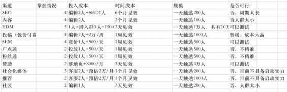 3.3、用户聚集地 用户都在哪里?所谓的鱼塘到底有没有?其实是有的,比如:qq群就算一个小鱼塘。 国内最大的程序员聚集地:CSDN、51CTO。 既然有鱼塘,有没有办法从里面钓鱼? 常规想到的是发帖子、不过这类方式来的太慢,不能满足公司的目标。至于这些渠道如何玩,在渠道的里面会做介绍。 从人群定位,我们可以得出,我们的产品投放人群:针对所有程序员的pc端,时间:周一到周五的工作时间。 四、渠道 非常开心,渠道是我的强项,因为我是网络营销出身,从seo、sem、自媒体、电商、社会化媒体、edm都有过操作。 按照我个人的理解,每个渠道都有流量,只是流量多少的问题,能不能支撑起来公司的业务目标。 4.1、渠道划分 按照获客渠道的三种类型,我们把渠道划分成:口碑渠道、有机渠道和付费渠道。 其中口碑渠道有:社交媒体(比如:微信、微博)、朋友推荐、社区推荐等等 有机渠道:SEO、内容营销、edm、投稿等等 付费渠道:SEM、广点通、粉丝通、赞助等等 其实每个运营人员都会想到这些渠道,但是好多人(包括运营总监)不了解渠道的特性,做方案的时候,只能胡说一通,搞了一个根本不能测试或者实行的方案。 有的时候产品是一个好产品,被一些不懂运营和推广的人给玩死了。 如果有幸在大厂,这种渠道划分的问题几乎不存在,随便一个渠道导量过来就足以让产品成为6位数的明星启动产品,不过大多数的运营并没有那么幸运,只能按照这些渠道来吸引用户。 4.2、渠道测试 罗列出来这么多的渠道,至于先投放那个,从掌握情况、成本、时间投入、产出时间、规模几个方面进行评测。 确认掌握情况:对于渠道的了解程度,团队中谁对渠道比较了解,让对渠道比较了解的人,确认渠道是否能用,按照5分计算,看看我们对渠道掌握分数是否及格,以及其他投入的计算,并且内部讨论渠道是否可以测试。