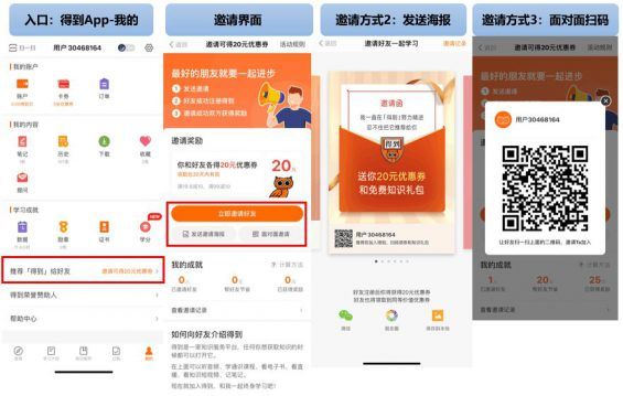 这些课程是针对成年人的通识教育,因此APP的目标用户是想要提升自我、信奉终身学习的成年人。 二、渠道 「得到」转介绍只有一个入口,在APP-我的-推荐「得到」给好友。 三、创意 这一部分将参照”转介绍效率=分享效率*转化效率*分享频次“进行拆解。 1.分享效率 (1)分享动力 用户分享的直接动力是20元优惠券,此外,邀请界面突出了对好友的利益性,减少用户分享的心理负担。具体表现在: 上方海报标题:最好的朋友就要一起进步 邀请奖励:你和好友各得20元优惠券 我的成就:帮好友节省XX元