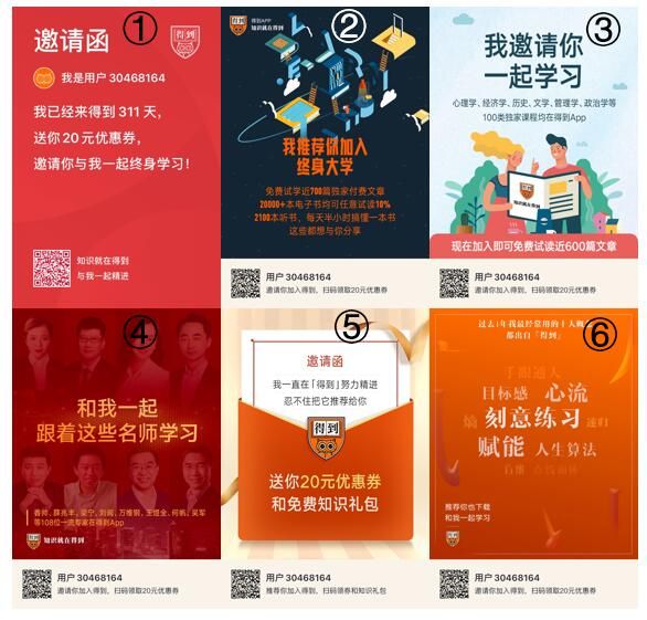 2.转化效率 (1)海报吸引度 可选择的海报一共有6张,可分为邀请函和海报两种形式,主要应用了海报要素中的信任背书与利益性。 信任背书 每张海报都在突出“我”,具体表现为“我已经来得到XX天“、”我推荐你“、”我邀请你“、”和我一起“、”我一直在…忍不住把它推荐给你”、“与你分享”、“我最常用…”。这里有两个目的: 贴近对话,为海报增添情感色彩,加强用户信任 凸显「得到」对用户的价值 利益性 物质激励是20元优惠券,此外突出各种免费或独家学习资料。 3.分享频次 邀请界面将邀请结果可视化,展现3个数字:已邀请好友XX人、帮好友节省XX元、已获得奖励XX元,强调邀请行为的“双赢”结果。而且小标题为“我的成就”,充分从用户角度出发,成功将拉新活动包装成为用户好的事情。减轻用户被动的感受,反而增强意愿和主动性,提高分享频次。