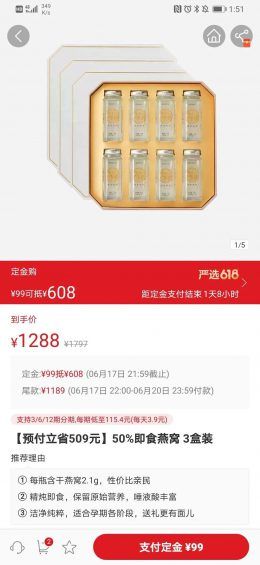 多层级满减活动设计的精妙点在于多层级满减中“档位”的设置。 一般的第一层级满减都是用来吸引用户的,主要特点有“门槛低、满减金额大”。 但是,满减之后的价格往往都会被“未到配送价”拦下,促进用户往第二层级走。 层级的顶点,一般都是以稍高于客单价来设定,高门槛、高抵扣,但不一定是高折扣,逐步提升用户的客单价。 另外,满减的设计还利用了用户的很多心理活动。 比如:贪婪——在自己消费范围能争取到最多的折扣; 比如:损失厌恶——眼看再买5块就能减20了,在用户心里,如果凑单不成功,那就相当于自己亏了20块钱。 赔本的买卖可是没有人愿意做的。 4. 定金膨胀 目前,“定金膨胀”已经是各大平台的固定促销方式,最近大促期期间,一定能看到其身影。 定金膨胀是利用了用户的什么心理?这个功能的优势在哪里? 大家仔细找一些定金膨胀的商品,大部分都是单价较高,或者利润空间较大的,这样就留下了膨胀这种方式的操作空间。