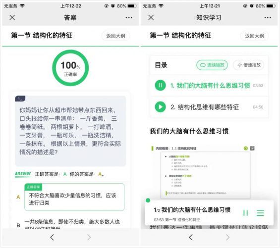 (复制学号+添加老师—–添加班主任,进入社群—-公众号复制学号—-进入课程界面—坚持学习查询返学费名单—微信返学费,支付宝也可以,原路返回–证书。) 三、创意 1.活动介绍: 21天结构化思维训练营,每天只需要20min,完成课业,无需打卡,坚持完成学习任务学费原路返回。课程主要包括两个方面《结构化思维》和《机构化写作》,课程质量还是可以的,有班班每日社群分享(记得当时我们那期的人很活跃班班还加了个了一个群加餐,当时用户体验感极佳感觉干货满满)、公众号的学习系统听强IP语音讲解+看文字讲解+课后测评,始终贯彻“教、学、练、测”。 落地页海报+结构化思维介绍内容