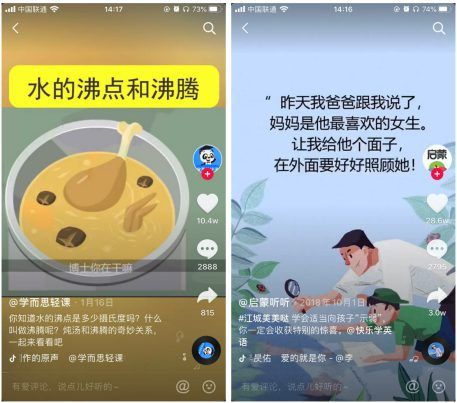 3.2 内容生产 流量运营方法有效的前提还是能生产适合的、被平台及用户所喜爱的内容,下面将对3种常用的内容形式进行分析:图文配音或动画、真人拍摄和视频剪辑。 图文配音或动画 这种形式以卡通人物或者图片结合音频进行呈现,在视频的生产上相对容易。但是如果想要被用户喜爱并推上热门的话就比较难。需要有比较好的选题、观点或者用有趣、直观的形式输出印象较为深刻的知识点。 所以,从这类型中播放及互动较高的视频来看,要么故事性强,要么观点简明能引起共鸣。例如:启蒙听听中讲述带孩子爬山的故事、学而思水的沸点等。