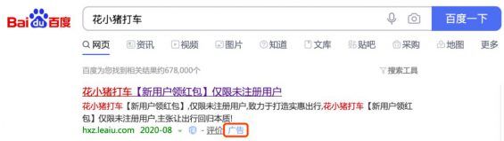其实这么一看,花小猪就有点出行领域拼多多的意思了。 至于它到底是不是出行领域的拼多多,我后面会讲。 因为用这款产品的人还不多,所以对每日羊毛的争夺还没那么激烈,毕竟很多人还不知道。 有羊毛的地方就有商机,我在百度上搜索了一下「花小猪打车」这个关键词,发现第一条就是一个关键词广告。