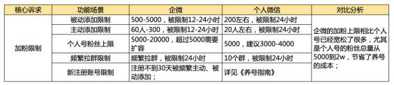 ①优势:活码功能强大:普通群二维码7天过期后就无法添加,而企微活码可以避免这个问题。 ②不足1:企微提供的群活码是群裂变中最常用的裂变功能,目前企微自带活码但支持5个群,5个群满人之后可以用新的群来替换这5个名额,不断的向前滚动,相比无限群裂变活码,还是效率低了一些。 ③不足2:所有群裂变中,最重要的不是活码,而是群机器人。但是由于企微限制自动回复和群发能力,导致群裂变场景中需要额外的人工介入,运维成本教高。(企微群的自动回复需要群成员@管理员,但是借助第三方工具可以实现群关键词自动回复) 2、加粉限制(企微防封能力更强) 但是企微加粉也同样会存在限制,如果忽略也容易导致无法添加用户而白白损失了用户,这部分我们也做了一个对比分析图:
