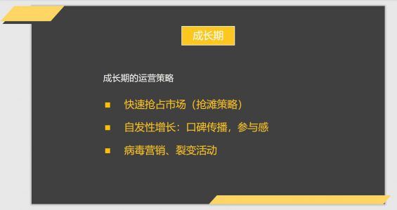 1)快速抢占市场,用抢滩策略 比如从华东到华南到华北,这样布局抢滩策略。 2)注意做口碑传播,让用户有参与感 让用户有参与感之后,他们更愿意为你传播,给产品带来自发性增长。 3)做病毒营销,裂变活动等 裂变活动是降低获客成本最有效的方式。 微信红包的案例大家都特别熟悉,14年微信在春节更新了抢红包的功能,配合病毒营销式的推广,用户量立马超过了支付宝过去几年的努力。 但其实微信支付是在2013年8月5日首次推出,14年1月4日,滴滴接入了微信支付,同月1月27日,微信推出了微信红包,让产品迅速推广开来,并且获客成本低,这都是微信在产品成长期的运营策略。