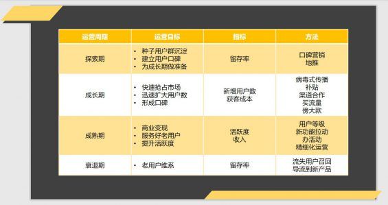 以上是产品4个生命周期中常常会用到的一些运营策略,最后我给大家整理了一张不同运营周期各自的运营目标、指标和方法的表格,大家可以根据自己产品不同发展阶段参考一下: