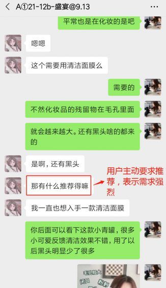当用户主动拍张照片过来、咨询有什么产品推荐,或者是对自己面部问题的描述很细致,就代表用户在问卷中选择的最迫切的需求是真的迫切,可以针对性的进行推品动作,在接待流程中直接转化掉。