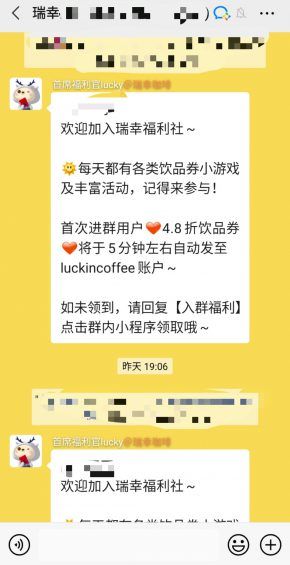 3)在我们进入“瑞幸福利社”社群之后,首次进群的用户可以享受4.8折的饮品券,5分钟之后就自动发布账户。