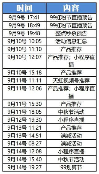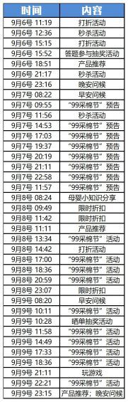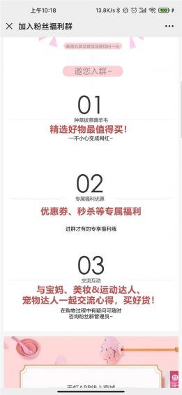 10 名创优品 ▌诱导入群福利 1、添加 @名创总剁主 领 9 元红包 2、社群专享福利 3、新品体验 4、折扣秒杀 5、群内抽奖 ▌引流路径 关注公众号 →点击菜单栏“联系我们”→ 点击“社群专享” 推送欢迎语 → 点击链接,扫码添加@名创总剁主 → 推送欢迎语 → 扫码进群 点击看大图▼ ▌企业微信群运营 1、无进群欢迎语。 2、 1 名运营:@名创总剁主 3、推送形式:文字+图片+小程序。每次推送一段文字,一张图片,一个小程序。 4、推送内容:新品推荐、满减活动、早安速报、小红书活动、节日活动。 点击看大图,左右滑动查看更多▼ 5、推送频次:每天推送3- 4 次,时间一般是10:00,12:00,15:30,17:30。周末不推送。