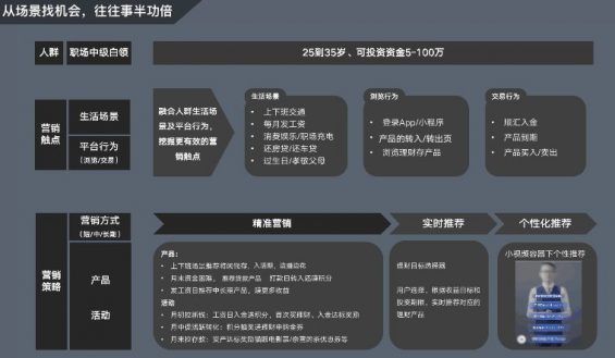阶段2:略有心得 上一个阶段,是不断造效率工具的过程,每个运营工作模块,都能够提炼几个效率工具。当你从烦杂中抽身出来,你开始深入思考:如何获得更多的用户,如何提高业绩数据?这是第二个大挑战。 这个阶段,我建议重点打磨两个能力:场景化经营能力、策略能力 2、场景经营能力:场景中找机会,事半功倍 入选理由: 1)增量的时代已经过去,存量时代来临,以往粗犷的经营模式难以为继,精细化、精益化经营成为主旋律 2)关注用户体验,注重场景化营销,能帮助你的运营脱颖而出,快速占据用户心智 面临问题: 1)没有场景化经营的意识,也不知道具体增益效果有多少? 2)精细化经营毫无头绪,无从下手 解决办法: 基本大部分的场景化经营都遵循下图的思考路径:人群+营销触点+营销策略 1)营销人群:目标受众是谁,用户画像如何 2)营销触点:目标人群的高频场景:包含生活中的高频场景和在平台上的行为轨迹。两者结合,寻找最佳营销触点。 3)营销策略:在合适的场景下面,找到适合用户的内容:是产品,还是服务,亦或者是活动,达到四两拨千斤的效果。 (示例图:金融白领人群的营销场景分析)