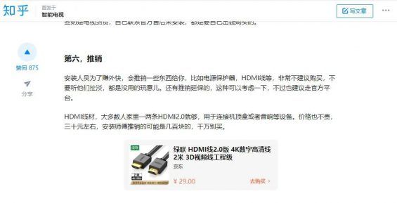 2016年知乎推出了值乎、live、知乎书店、盐club等产品,这是知乎自己商业化的道路。针对企业来,知乎推出品专、超级话题、IP联合等营销方式,这些方式适合知名企业品牌,如宝马、大疆。中小企业品牌一般不选,不仅是因为需要的营销资源多,还因为高昂的合作报价,相比之下,他们大多数更喜欢选择内容营销——长尾且低廉。 图源:知乎效果广告 | 品牌专区&超级话题 到了2020年,知乎升级营销插件为知+,规范了内容营销的方式,丰富了广告营销的形式、整合了PU营销,企业在知乎上营销更便捷系统了。而且知乎的消费链路随着知乎的改版也越来越完整,【好物推荐】功能打通京东、淘宝、拼多多、苏宁、知乎商品等平台,知乎创作者可以通过内容卡片、直播商品橱窗带货。知乎从【消费内容】到【内容消费】的转变是企业知乎营销的重要土壤。 图源:知乎@蓝大仙人《电视收货时需要注意哪些要点?》 二、企业如何在知乎运营? 企业在知乎营销方式大致可分为四类:内容营销、广告营销、红人营销、活动营销。这几类可以单点使用,也可以组合使用;可以走官方渠道,也可以场外操作,下面分点阐释。 1、内容营销 内容营销是知乎最基础、最常见的营销方式,也是其它营销方式的形式承接。这里我将内容营销分为两种,一种是常规形式,一种非常规。 常规形式包括:回答、文章(包含专栏)、想法、视频、短评(评论区)、圈子。这6种形式,除去圈子比较特殊外,其它几种都是每个机构号都拥有的功能。圈子是2019年11月知乎推出的功能,类似于微博,多发布短图文,后来支持将视频与回答文章同步到自己所在的圈子。目前处于不温不火的成长状态,对于圈子的营销可以酌情投入。