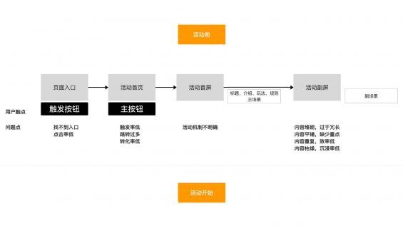 进一步的可以从表中连线发现一些常用组合规律,如:「产品首发,狂撒1亿红包体验金,分享有奖」(曝光-首发-抢红包-红包)。设计师通过关键词动线,构建运营组件,下次在类似的活动中即可场景复现,提高设计整合能力与产品迭代效率。 三、运营活动的用户触点 本文所提出的活动首屏设计,不针对某一具体案例做拆解,所以从产品的角度,挖掘活动前中后期通识性较强的触点作为“峰终定律”的设计转化。