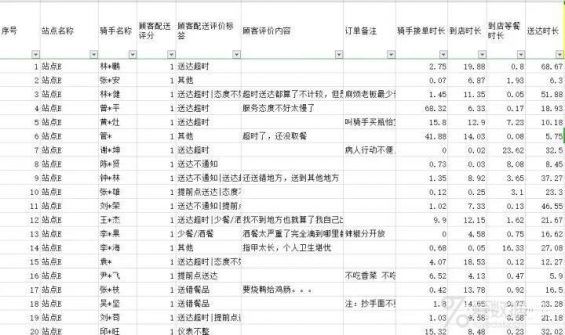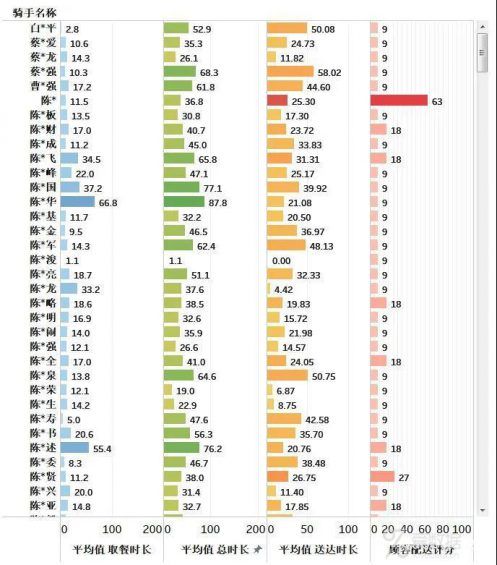 根据上图可知,差评最多的是A,B,C三个站点, 共同原因是“送达超时”,“态度不好”“少餐/洒餐” 2. 骑手对比 骑手总体配送情况