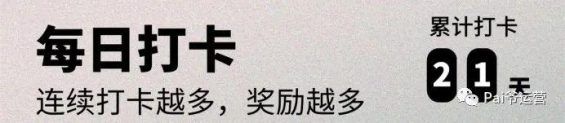 另外客服每天都需要督促成员进行打卡动作,并配上相关的文案,例如第一天可以写:早安!这是你第1次天打卡,千里之行始于足下!这里需要注意的是在描述天数或次数时用阿拉伯数字来体现,不要用文字,因为用具体的数字会让人一眼看到有一种成就感。然后每天的文案要根据每日不同场景进行设置以免过于单调。 打卡奖励 任何一个21天计划都是需要配合奖励制度的。哪怕是个人自己去做,更不用说哪些企业商家了。毕竟都是要通过这个打卡计划可以最终实现用户转化和留存。 所以打卡奖励的设置就变得尤为重要。最常见的奖励一般都是以积分形式出现,并且随着打卡次数的累计可以获得不同梯度的奖励,例如第1天奖励1分,第2天奖励2分,第3天4分,第4天6分……设置成阶梯式的奖励机制可以有效激发参与者的积极性。