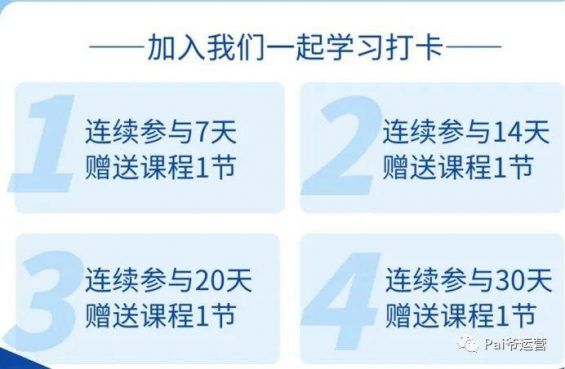 全方位了解21天打卡活动所有细节,实现用户留存率超90% 在行为心理学里,有一种现象叫21天效应。意思就是说一个人的动作或想法,如果重复21天就会变成一个习惯性的动作或者想法。 也正因为有这种科学理论的存在,所以这几年在各个行业,尤其是教育培训类的营销活动中,几乎都在应用21天效应。例如:21天英语阅读、21天练出马甲线、21天朋友圈打卡……。 现在很多互联网公司都不会直接推销自己的产品,而是通过引流建群,以共同学习、进步等为噱头,通过21天打卡学习,来实现最终的用户留存和转化。这套方案在很多领域都适用尤其是在线教育/培训行业。
