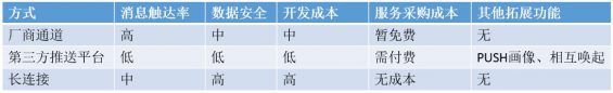 PUSH消息在消息系统创建好后进入发送阶段,服务端需要根据用户终端信息进行路由,如果是IOS系统,那么会调用苹果自身的推送通知服务(APNs),如果用户的手机是安卓系统,那么根据不同的厂商去调用不同的厂商SDK。 对于不同的系统版本,支持的消息展示形式也是不同,比如IOS10之后,当APP在前台时,是否通知栏展示;此样式可以根据产品需求来选择,有服务端传输相应通知方式的值即可。如果用户的手机非五大厂商内的手机,可以通过自己搭建的长连接或者使用第三方服务进行推送。 如果不是自己直接对接厂商通道,那么内部的服务端可能无需做过多较为复杂繁琐的开发工作,通过接入第三方消息推送平台来实现消息的推送,比如信鸽、个推等。多数的通道会将消息是否成功推送到客户端SDK的回执数据反馈给发送方,需要提供回调地址。 四、底层通道说明 4.1 推送通道 通道类型一般分为三类:厂商通道、第三方推送服务平台、长连接。 厂商通道是手机终端厂商推出的推送服务,通过接入厂商SDK,内部服务端可以将消息推送到手机系统的服务端,再下发至客户端内部的厂商SDK,由操作系统进行相应展示,点击后唤起相应APP,这样可以避免APP进程被杀死后消息无法触达用户,因此触达率较高。 第三方推送平台是推送服务公司自己搭建相关的消息服务。并且各个APP使用了同一个平台的推送服务时,客户端都是集成同一个第三方推送平台的SDK,因此形成了一个推送联盟,当联盟中的其中一个APP的消息进程没有被杀死的时候,其他的APP也可以利用进行通知用户,形成了相互唤起,提高触达率。 经过一些场景的测试,相互唤起的成功率并不是很高,需谨慎结合自身场景评估。为了提高触达率,第三方推送平台也会集成各大厂商的SDK进行推送。 长连接就是建立手机与服务端的一条链路进行消息数据推送,通过长连接也可以进行APP状态监控,但完全由长连接推送且保证触达的稳定,需要投入的研发资源较多,且需尽量避免自己的长连接进程不要被操作系统杀死。 4.2 优劣势对比