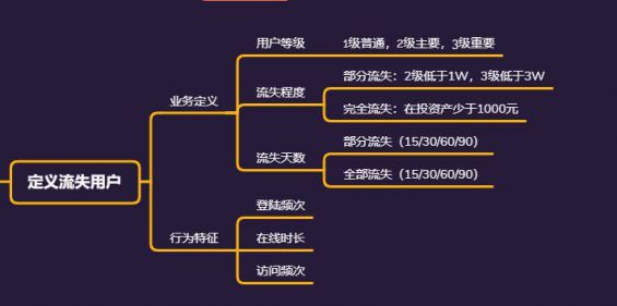 比如我们定义:提现7天未进行投资,且资产低于30%即为部分流失,已经达到了预警触发。 时间长度的判断上要结合产品和用户特征进行具体的数据分析,我们可以从友盟或者其他埋点平台查看用户平均多久登陆一次,每次查看多久,以及投资提现频率(特别是到期提现与投资行为)。 分析流失行为征兆,是提前识别流失用户的前提,这里我直接将流失用户按照部分流失和全部流失(分别以金额和时间两个维度),并且划分用户等级,进行精细化运营。
