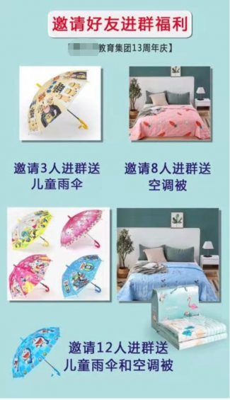 5月27日,朋友圈做了第二次福利,需要进群领取儿童雨伞、空调被,发群二维码吸引家长进群,有了第一次活动的铺垫,第二次快速吸引了多人注意。