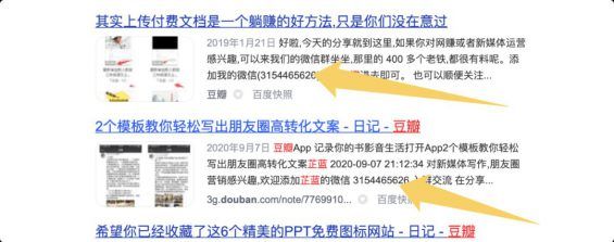 ② 怎么用豆瓣小组引流 在豆瓣小组上引流有两种模式:在别人的小组里引流和自己建立小组引流,这两种引流方式各有利弊。 别人的小组的话,流量高,被曝光的几率高。但是你写内容,除了要遵守豆瓣官方的规则,还要小心被组长删帖。 在别人的小组里引流有几个技巧。首先,根据你业务的领域找到合适的、贴数较高的小组。例如你是做闲鱼或者淘宝课的,肯定就找二手交易。你是做知识付费的,就去找相对应的行业或者新媒体小组。 其次,发帖和写文章,要利用一些 SEO 的技巧! 例如,标题尽量不写大词,长尾词容易上快照。正文第一段的第一行尽量留下微信号,保证上了快照后,用户能直接看到你的联系方式,也防止原贴被删除后前功尽弃。 最后,就是之前说的顶帖问题了,我这里就不赘述了,可以看下截图。有一个需要注意的是,千万别用那些顶帖软件,我之前用过,被封了2个号。 再说说自己建立的小组,主要目的就是为了做百度 SEO,目的是为了做关键词组合并被百度收录。 所以,小组的名称就特别的关键了,你需要起一个符合搜索习惯且指数还可以的长尾词。另外就是,由于前期小组人数少,你还可以喊一些朋友来帮忙,短时间内多发帖,这样可以让你上豆瓣的小组推荐首页。 4、豆瓣日记 这个就是常规操作了,跟各大平台的发布文章一样。日更最好,如果做不到,坚持每周在豆瓣上发 2-3 篇内容,或长或短,然后在文章末尾放置引流钩子,来达到最终引流目的 最后给大家推荐一个我关注的豆瓣博主,带货还是很稳的,不是广告,就是想让大家看看她是怎么在豆瓣上做好物推荐的。