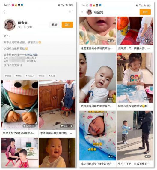 ① 账号定位 昵称中“笑”是一个情绪词,“悟”是个动词,领悟一些道理,作为情感视频号的名称,容易记忆,同时凸显感染力,且显示为认证情感自媒体令账号更具说服力。 ② 账号包装 通过简介,号主起伏颠荡的人生经历,我们不难看出这是一个真实存在的人,而且采用真实头像作为账号头像更添亲切感。 ③ 内容呈现 笑笑悟每天用3-4分钟把这些年自己的经历梳理出来,然后运用故事的感染力去感染粉丝,让粉丝自发点赞、评论、转发。 故事模版:个人故事+起点低+过程苦+结果好。背景音乐可采用前段悲情+后半段励志。 2)生活视频号:萌宝集