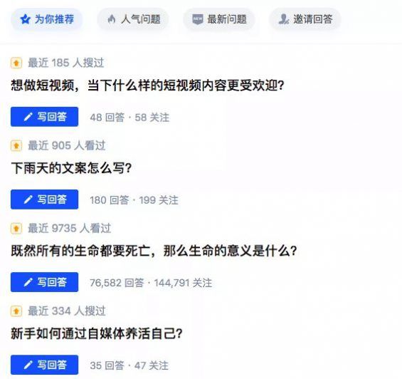 2)人气问题(https://www.zhihu.com/question/waiting?type=hot) 主要推荐一些当下比较热,关注度比较高的问题,但通常关联性不高,具备时效性,热度消的比较快