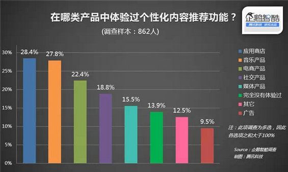 盘点科技圈里的时髦词汇,必然少不了一个词:个性化推荐。 借助个性化推荐技术,互联网产品获取或积累用户的兴趣喜好数据后,可以直接为用户提供每个人感兴趣的内容,以此提升产品的内容吸引力。 想要在产品里添加个性化推荐功能已经不是一件难事,事情的难点在于推荐的内容是否准确。为了解目前用户对该类功能的反馈,企鹅智酷推出了一项调查,以下就是调查结果: 86%用户体验过个性化推荐,应用商店覆盖度最高 参与调查的用户在反馈自己的使用体验时,仅有13.9%的用户表示完全没有体验过个性化推荐功能。剩余86.1%的用户都获得过根据自己的喜好或习惯形成的个性化内容。 回归到具体在哪些产品里体验过该功能,应用商店的占比最高,28.4%用户在应用商店里体验过个性化推荐。其次是音乐产品,用户比率为27.8%。排在第三位的是电商类产品,占比为22.4%。 广告是用户体验个性化推荐时占比最低的产品领域。这反映出用户可能很少发觉展现在自己眼前的广告具有个性化元素。 只有24%用户认为产品个性化推荐靠谱 推荐的内容是否准确决定了这个功能的吸引力。从用户反馈来看,超过一半的用户认为,自己获得推荐只是少部分准确。当然,也有24%的用户表示大部分的产品个性化推荐准确,11.9%认为完全不准确。 相比于推荐技术,用户还是更相信自己 既然来自于技术的推荐只是少部分准确,那么用户会更信赖谁呢?答案还是用户自己。30.2%的用户选择不相信推荐,只相信自己。 除了相信自己,群众的眼光可能也是雪亮的。25.9%用户认为多数用户的选择更加可靠。个性化推荐技术在信任程度上排在第三位。 一个让人意外的结果是,仅有15.8%的调查者选择相信专业人士的推荐。 超过一半的用户需要个性化推荐技术 对于使用个性化推荐功能的产品而言,虽然不能提供让用户完全满意的推荐内容,可用户还是需要这样的功能。54.5%用户反馈称需要产品中添加个性化推荐,20.1%仍在犹豫中,剩余25.4%的用户则表示不需要。 由此可见,对于准确度还有待提升的推荐技术,用户保持了更开放的态度。 结论:如何猜透用户的心思和需求 能够基于用户数据提供个性化推荐,这是互联网产品可以提供的一项特色功能。可从目前用户的反馈来看,这种推荐很难达到用户所期待的准确度。不过,即便不够准确,用户需求依旧存在。 结合这样的反馈,产品在设置个性化推荐功能时,除了要不断完善推荐算法的精准度外,其实还有一些讨巧的方式,既防止让不准确的推荐吓跑用户,又不至于让用户面对海量内容时不知所措:
