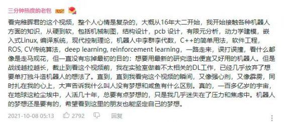 另一方面,以兴趣为出发点,不考虑追求热点,反而有奇观效果。这些超越普通人想象的想法与行动,其动力源头是热爱、兴趣,而不是解决生活所需或是功利性的。这种热爱与专注的外化表现即为其作品,用户能从中感受到真正的极客精神,即建立在能力基础上的好奇之心与改变之力。 正如@稚晖君在视频中所说,机器人一直是他感兴趣的一个方向,而市面上的机械臂都不够酷,于是不如自己造一台很酷的机械臂。设计完成之后,他还将大部分资料做了开源分享。 最后,则是击中了Z世代的心理需求。不少用户因为感受到创作者的专注与热爱,而从这些作品中汲取力量,将何同学、稚晖君等UP主作为精神偶像,无数用户在评论区中留下他们的心路历程。