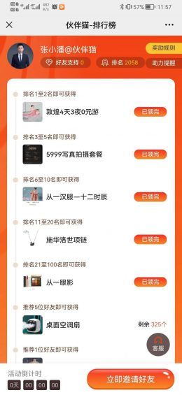 由于疫情的影响,线下自然流量面临锐减的情况,如何给企业的门店低成本导流,成为了企业实现持续营收的关键瓶颈。 今年8月初,长沙总部的企业的获客增长负责人,和伙伴猫团队进行对接,准备做一场线上活动发起,引流到线下的裂变增长活动。 由于这次活动需求是希望获取到目标顾客的电话号码,因此本次活动就选择了伙伴猫的【活动裂变】玩法,这种玩法的好处是在于不仅能获取到目标人群的联系方式,还可以引导顾客及时加到企业微信上,可谓是一举两得,非常适合有销售团队跟进客户的企业使用。 活动诱饵设计分析 活动的引流诱饵设计: 因为目标用户,是女性群体,年龄锁定在20岁-40岁之间,需要设定一个与之年龄段相符合,具有高价值感的引流诱饵。经过筛选,决定以古装拍摄特定的【从一柔雾口红】,作为无门槛的活动引流诱饵。引发用户报名参与,并可以免费领取。 裂变诱饵设计: 用户通过引流诱饵【从一柔雾口红】参与活动了,如何引导用户持续裂变呢?这就牵扯到另外一层诱饵-裂变诱饵。在活动中,如果你邀请好朋友免费领取【从一柔雾口红】,你也会得到一次活动的助力,达到助力标准后,就可以获得更高价值的活动奖励。 在这个活动中,从邀约达标奖励,到PK排名奖励,一共设立了7层奖励机制。 ①排行榜第【1-2】名:敦煌4天3夜游 ②排行榜第【3-5】名:5999写真套餐 ③排行榜第【6-10】名:从一汉服 ④排行榜第【11-20】名:施华洛世奇黑天鹅项链(小号) ⑤排行榜第【21-100】名:从一12色眼影盘 ⑥推荐【5】人:桌面空调扇一台 ⑦推荐【3】人:手持精美小风扇一台