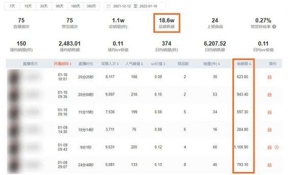 目前该账号每天直播3- 4 场,每场9- 40 分钟,月销18. 6 万,佣金比例40-50%。如图。 直播月销数据▼