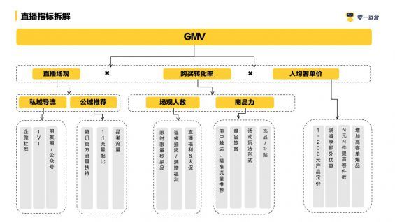 / 趋势及需求解读 行业趋势概述 从西城男孩演唱会到五月天跨年,从春晚到冬奥,视频号依托微信的优势及价值正在符合预期的显现出来,对「全民心智的渗透」是数据爆发的先决条件。 另一方面,视频号生态的官方政策、技术基建也在以双周为单位进行升级迭代。在官方高频的曝光动作和针对入局者的扶持策略下,从近期的大盘数据、参与直播的类目构成变化可以看出,用户对「视频号直播间」的消费习惯,正在从「内容消费」扩至「实物消费」。 微信生态各板块顺畅的无缝跳转逻辑,正在让 用户习惯发生「范式转移」 。 其中针对近期生态基建的加速,我们以「直播前/中/后」为界限,对3月中旬为止更新的各类功能进行了一轮分类: 从整体来看,更新分两方面: 直播技术层: 直播间内与直播间后台的技术层已经可逐步向抖音等平台看齐; 这部分的更新主要目的为直播团队本身实现提效,给直播的创新玩法配备更多功能设施,确保直播的价值评估、数据回收、前期流量导入和后期沉淀更高效便捷。 私域生态层: 与企微私域生态、小程序生态进一步打通,让用户的跳转体验更优; 这部分的更新对于在企微和小程序有一定沉淀的品牌来说是利好,并且我们认为这部分的滚雪球效应会愈发强化。 需求及痛点解读 在上述趋势基础上,从更实在、落地的层面出发,针对各品牌入局私域、视频号直播的痛点规律,我们对视频号直播的价值定位、及其背后的逻辑进行了一轮推演。 我们认为视频号直播最关键的,在于大幅优化了当前企微私域的 「流量利用效率」 。 「私域」的本质是通过精细化的「会员运营」完成更高效的「单客产出提高」。 无论是优化用户结构、提升优质会员占比、挖掘会员需求、沉淀用户数据等均是为了此目的, 即实现「单客流量利用率最大化」 。 当前大部分品牌企微私域,在社群、1v1、小程序商城之外, 「单客流量利用率」其实还有非常大的挖掘空间。 这个挖掘空间需要更深入、具针对性的运营策略,本质上就是「优化内容策略」。 因为所有 撬动转化的办法都依赖于内容(私域 IP 体系、社群、朋友圈、1v1等内容触点环节的维护)。 长期来看,更精准、具备针对性的内容产出需要依托大量数据,且受限于品牌本身SKU的多寡。并且 图文内容总会面临「转化效率低」、「触达能力弱」,也不符合用户现在的内容消费习惯,在「内容好坏」的定义以及「投产比」的反馈上都不够明确。 基于上述的推演,我们认为针对当下的最优解就是「视频号直播」,以及背后公私域 1:1(1:10甚至更高)的流量扶持策略。 视频号直播首先提供了一个优质且高效的「内容场景」。 运营策略的可发力点能够从社群、1v1等单点优化中匀出更多精力,用于「直播间宣发及承接运营」,为内容做好吆喝。 根据艾瑞的研究报告以及多方求证,直播间转化的效率普遍高出图文 2-3 个百分点。 企微存量用户即便是暂时不具备购买需求,只要对运营(甚至导购)通过有效激励,铺开宣传面,被直播间主题与内容吸引进入直播间是大概率事件。 在用户点击进入直播间的一刻,即便该用户在全渠道的GMV贡献只有0,他也当时发挥了两倍、甚至更高的流量价值。 此时单客产值不仅反映在了「客单价」上,还可以反映在「降低流量成本」上。 能降低多少成本、额外的流量价值有多大、是否精准,则取决于直播间的与用户标签的匹配度,匹配度依赖于开播频次带来的数据积累量,是一个纯粹的滚雪球复利逻辑,有极强的先发优势。 最终我们都是朝着私域的整体提效前进,「视频号直播」是通向这个结果的拓荒工具。 更多针对品牌具体调性、产品、其他平台直播间、行业竞品的拆解分析,以及引流款、爆品款、关联销售组合策略,此处由于脱敏无法作过多保留。 在完成近十份针对头部品牌的视频号直播提案并成功合作后,上述的整套认知适用于匹配许多企业入局视频号直播时的真实痛点: 通过做好视频号直播的内容、做好视频号直播前后的私域运营,提高流量利用率撬动更多新的流量、公域订单增量,放大全域的营收增量,加速「品牌私域」的构建。 / 直播规划策略 阶段规划解构 于是在上述趋势与品牌需求痛点解读后,我们就可以进入到具体的直播规划了。 由于这部分基本是围绕品牌的特性后,在品牌脱敏后留下的内容不多,我们主要会梳理几个板块如: * 直播间的预期目标人群 * 直播项目GMV拆解共识 * 项目POC的阶段划分(筹备/启动期 – 承接期 – 稳定增长期) * POC阶段各数据目标 这几part我们决定将相关的提案内PPT页作部分呈现。 (公式拆解页可复用,阶段拆解与各指标值与实际品牌方特性、需求、资源、企微私域体量等因素强相关,此处仅供逻辑层面上的参考) 直播间策划 针对筹备启动期,本质上是需要完成第一轮的「人/货/场」三要素解构。 品牌在每年各个阶段都会有相关的营销主题方向,市场上对于直播间成为各品牌「营销新阵地」也有了共识。视频号直播间绝不仅是实现「转化目的」,他还承载着相当多的市场营销诉求。 为此,我们需要契合品牌方的营销主题、针对主题进行逐级的拆解。 对主题进行解构、拆解出主题背后品牌方希望针对的用户需求、并完成关键词与标签的提炼后, 开始自上而下地进行直播策划。 第一环是基于直播间的关键词拆解,然后进行推演: