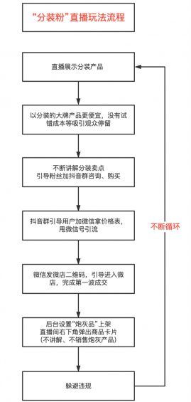 今天,要说的不是“小样粉”,而是“分装粉”,引流逻辑、粉丝性质与“小样粉”完全一样。主播不出镜,简单好操作,效果也不错。我们观察的引流直播间,直播1.5小时可往抖音粉丝群加300+人,每天播3小时,按20%导粉率算,每天能往微信加150+爱用大牌的女性客户。 所谓“分装粉”,即:主播展示自家(微信端)微店的大牌美妆分装产品,介绍克重与卖点等,吸引观众停留并引导进入抖音粉丝群,有人进群立马甩微信号,将粉丝导入微信成交并做复购。 挑几款美妆商品上车,当“炮灰品”,偶尔弹出挂车的商品卡片(即炮灰品),做做样子。但是,仅限于做样子,主播不用浪费时间讲解,全程疯狂讲分装品引流。 说白了,“分装粉”整体玩法与“直播引流小样粉”几乎一样,一张图说清楚。
