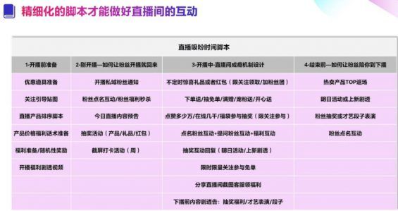 整场直播脚本就是以整场直播为单位,规范正常直播节奏流程和内容。 三、直播流程 整场直播脚本一般都会包含时间、地点、商品数量、直播主题、主播、预告文案、场控、直播流程(时间段)等几个要素。 最后再说说直播流程。 直播流程包括详细的时间节点以及在该时间节点主播要做的事和说的话。 开场预热:打招呼、介绍自己、欢迎粉丝到来,今日直播主题介绍; 话题引入:根据直播主题或当前热点事件切入,目的是为了活跃直播间气氛,调动粉丝情绪。 产品介绍:根据产品单品脚本介绍;重点突出产品性能优势和价格优势(直播间活动); 粉丝互动:直播间福利留人,点关注、送礼、抽奖、催单话术、穿插回答问题等; 结束预告:整场商品的回顾,催付;感谢粉丝,引导关注,预告下次直播时间、福利和产品活动。 下播之后,别忘了对本场直播进行复盘。 需要注意的是,脚本不是一成不变的,每一位直播带货人都应当学习不断优化,不断调整。 你做直播时间长了,自然对直播脚本怎么写也会了然于胸,对于直播脚本的运用也更加得心应手。 |