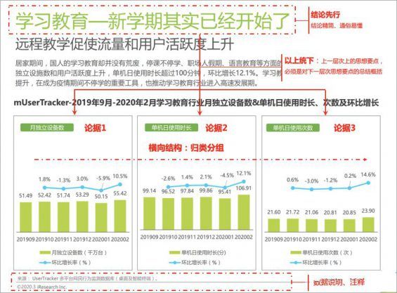 能不能写一份优秀的分析报告,是衡量分析师是否牛X的重要标准。 除了不同场景下特定的分析逻辑,怎么把分析报告写的更好,其实是有成体系方法论的。 今天给大家分享一篇关于数据分析报告规范的干货,常看常新,值得收藏和细品。 01 结构规范及写作 报告常用结构: 1. 架构清晰、主次分明 数据分析报告要有一个清晰的架构,层次分明能降低阅读成本,有助于信息的传达。虽然不同类型的分析报告有其适用的呈现方式,但总的来说作为议论文的一种,大部分的分析报告还是适用总-分-(总) 的结构。 推荐学习金字塔原理,中心思想明确,结论先行,以上统下,归类分组,逻辑递进。行文结构先重要后次要,先全局后细节,先结论后原因,先结果后过程。对于不太重要的内容点到即止,舍弃细枝末节与主题不相关的东西。 2. 核心结论先行、有逻辑有依据 结论求精不求多。大部分情况下,数据分析是为了发现问题,一份分析报告如果能有一个最重要的结论就已经达到目的。精简的结论能降低阅读者的阅读门槛,相反太繁琐、有问题的结论100个=0。报告要围绕分析的背景和目的以及要解决的问题,给出明确的答案和清晰的结论;相反,结论或主题太多会让人不知所云,不知道要表达什么。 分析结论一定要基于紧密严谨的数据分析推导过程,尽量不要有猜测性的结论,太主观的结论就会失去说服力,一个连自己都没有把握的结论千万不要在报告里误导别人。 但实际中,部分合理的猜测找不到直观可行的验证,在给出猜测性结论的时候,一定是基于合理的、有部分验证依据前提下,谨慎地给出结论,并且说明是猜测。如果在条件允许的前提下可以通过调研/回访的方式进行论证。 不回避 “不良结论” 。在数据准确、推导合理的基础上,发现产品或业务问题并直击痛点,这其实是数据分析的一大价值所在。 3. 结合实际业务、建议合理 基于分析结论,要有针对性的建议或者提出详细解决方案,那么如何写建议呢? 首先,要搞清给谁提建议。不同的目标对象所处的位置不同,看问题的角度就不一样,比如高层更关注方向,分析报告需要提供业务的深度洞察和指出潜在机会点,中层及员工关注具体策略,基于分析结论能通过哪些具体措施去改善现状。 其次,要结合业务实际情况提建议。虽然建议是以数据分析为基础提出的,但仅从数据的角度去考虑就容易受到局限、甚至走入脱离业务忽略行业环境的误区,造成建议提了不如不提的结果。因此提出建议,一定要基于对业务的深刻了解和对实际情况的充分考虑。 再进一步,如果可以给出这个建议实施后的收益,下单转化提升多少、交易提升多少、能节省多少成本等,把价值点直接传递给阅读对象。 上面讲了报告的写作原则,举个例子,参考艾瑞网,《留存与未来-疫情背后的互联网发展趋势报告》: