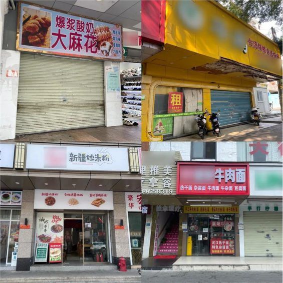 发现2:非刚需、无需体验的门店几乎消失! 讲道理,我们都知道非刚需,无须体验的产品门店,在被电商化以后丧失了竞争力,例如以前随处可见的护肤品日化店、义乌小商品精品店、图书用具文具店等,现在踪迹难寻…但是,这张图里有个例外,不知各位关注到没有?那就是服装店。 让老匡好奇的是,我们明知道服装类目几乎100%被电商化了(因为现在线上买衣服体验感完全不输线下,比如7天无理由退换货、智能尺码推荐等)。在这种被电商全面取代的大背景下,服装店的生存率凭什么能排到第二位?为何线下服装店还能生存?就问你好不好奇? 实际上,经过分析,我们得出的结论是这样的:线下服装店有没有搞头?有!但续存的门店,超过90%+开在步行街、地铁口等人流量超大、人口超密集区域。而且看上去,生存状况普遍不太乐观(促销策略除外),门口无一例外贴满了“清仓甩卖”“特价促销”“合同到期”等大字报,如图。 所以,各位开店要谨慎,现在选址,不是几年前闭眼冲了,不同类目选不同区域,这个很重要,也是你看完本文的理由。 发现3:每倒闭10家街铺里,6家干餐饮! 在街铺、社区、写字楼倒闭的79家门店中,餐饮店暴毙率最高。每倒闭10家街铺就有6家干餐饮,例如:自选快餐、桂林米粉、酸菜鱼、炸鸡店等。 倒闭餐饮店▼