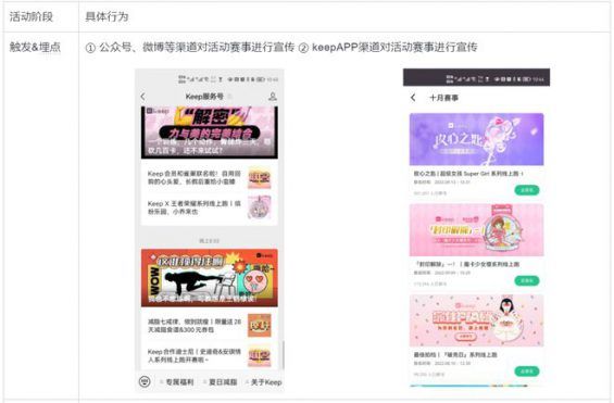 4、分析用户促活机制 4.1 用户活跃行为的定义: APP活跃-课程活跃:参与课程 APP活跃-社区活跃:参与圈子讨论贡献活跃度 APP活跃-活动活跃:参与活动 付费活跃:付费购买课程&会员&周边商品 4.2 keep促活目的: 将用户引流至APP、小程序,通过体验课程、参与活动,最终实现用户留存及变现 针对低活用户采取的低成本较高回报的促活策略 4.3 促活机制总结 ① keep的促活机制是非常符合keepAPP本身的属性和用户画像的,基于运动课程与知识,通过用户的运动行为与活动分享行为获得激励,从而促进用户的活跃程度 ② keep的成长体系、成就体系划分等级、排名和权益,可以持续激励用户向更高的等级和下一个勋章迈进 4.4 促活渠道拆解 【渠道-玩法】 APP渠道-虚拟空间