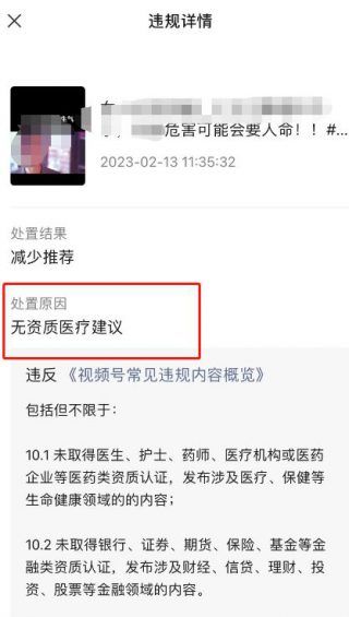 第四次,无医疗资质,发了医疗健康类的内容。 这四次违规,除了第一种情况,其它三种情况,我还是第一次遇到。 提到这些违规,我其实挺郁闷的!! 原因1: 你要说医疗资质这个,我是认罚的,确实是犯规了,当时大意了。 我也是因为看别人的视频号视频上有那些文字,点赞还挺高,所以我也就以为没有什么问题了。 结果…… 原因2: 你要说文字过多覆盖主画面,其实我的视频,跟视频号上所有的漫剪视频,是一样的排版方式。 只是我中间的视频,用的不是动漫视频而已。 那么多漫剪号,平台不说文字太多,遮挡主画面,而说我的那个遮挡主画面? 我其实在这个之前,还做过一个书单号的,也出现过这种问题的提醒,我当时也是挺郁闷的。 因为很多书单号,人家怎么就没有问题呢? 原因3: 你要说我用了狂飙里面的视频片段,属于侵权,我是承认的,这个确实是侵权。 但是你去视频号上搜索一下,一大把的发狂飙的视频片段。 那凭什么就说是我的侵权了,人家的怎么就好好的,还点赞几万10万+的呢!! 当然了,郁闷归郁闷! 处罚这个事情,我们这些创作者也没啥说的,毕竟平台是人家的,我们在平台上玩,就得遵守规则。 要说公平,哎,别说这些平台了,整个社hui,哪儿有什么公平可言! 所以,我们只能“适应”!!(适者生存) 毕竟常在河边站哪有不湿鞋的呢? 通过这几次违规,我总结了3条建议,分享各位做视频号运营的同学,避免踩坑! 1、做内容之前,一定要阅读和了解平台规则 虽然我知道看了这个也没多大作用,但是了解一下,心理有点印象,对于我们后面做内容运营的时候,还是有帮助的。 当然最好的方式,就是多罚你几次,你就记忆犹新了!就像开车违规被交警罚款一样。 但是我们绝大多数是普通人,也就一个视频号,一旦被处罚限流,还是挺郁闷,挺被动的。 所以,还是能看就尽量多看,多了解官方规则。 同时,平时网上留意一些相关方面的内容,避免踩坑。 规则查看和学习入口:创作者中心 > 页面底部“帮助与反馈” > 规则中心