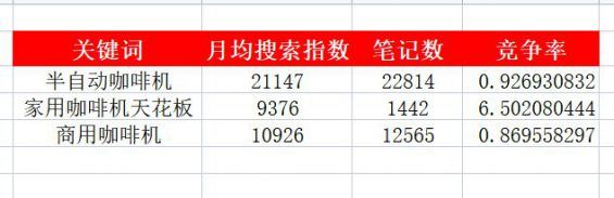 图2:咖啡机搜索量热度 确定次数后,接下来需要通过Excel整理该词竞争度,竞争率越高,间接说明市场越蓝海。 图3:咖啡机竞争率情况 第三步:查看品类发布量 ️如果想进一步确定品类竞争度,可用灰豚,去看品类词每天发布量,搜索关键词看,半自动咖啡机每天发布量14条、家用咖啡机2条、商用咖啡机7条。