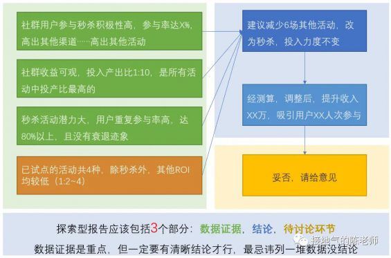 三、探索型报告 探索型报告适用于:向有一定了解程度的人,提示下一步行动方向。注意!这里给的是“提示”,是“建议”,并非结论。因此探索型报告必须有较强的逻辑性,得解释清楚自己列举的数据与给出的结论之间有啥逻辑关系。最后的提示/建议,也是建立在坚实的数据基础上的。 探索型报告的逻辑可以有很多种,最简单的就是:正反举例法