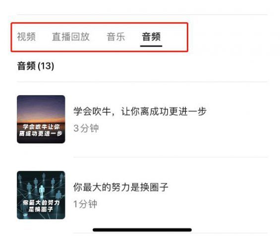 01 我们先来看看看音频在哪个位置. 打开视频号主页,这里默认第一个栏目是【视频】 ,然后后面,依次是【直播回放】【音乐】【音频】栏目。