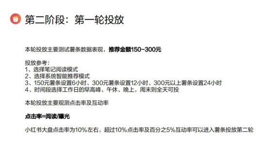 3)第三阶段:趁热打铁 能够进入到第三阶段的笔记,都有成为爆文的潜质,可以适当加大预算,拆分为多个订单同时推,趁热打铁,引爆笔记(数据标准都放在下图中了,直接抄作业) 4)第四阶段:循环投放 基本可以认定为优质素材,这种笔记可以薯条带来的曝光中带来不错的互动数据,可以设置循环订单持续投,直到笔记数据达不到标准为止(数据标准都放在下图中了,直接抄作业)