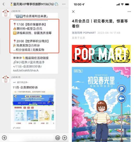 3、惊喜权益 送礼品:根据消费金额或次数,赠送精美礼品,提高消费者满意度。 免费试用:提供免费试用机会,让消费者体验新产品,增强购买意愿。 线下活动:提供线下派对、音乐会等机会,增强会员忠诚度和消费体验。 品牌可以根据现有会员等级体系、会员规模、会员消费行为数据等,结合品牌产品类型、活动成本综合权衡,设计会员日专属权益,在设计时还要兼顾好长远价值和短期利益。 03 活动场景和宣传渠道设计 设计规划好会员日的框架后,需要考虑会员日的实际应用场景了,主要分为线上和线下两个渠道,相对来说需要准备的内容差别还是比较大。 1、线上 线上渠道可以选择电商平台、公众号、小程序、社群等渠道作为活动承载。 需要做好活动的流程设计,重点在宣传上,文案和图片如何更能吸引用户参与。 还尽可能打开流量敞口,做好触达和引导,让活动被会员知道,并让其快速加入进来。尤其是私域场景内,需要做好活动的预热和宣传。
