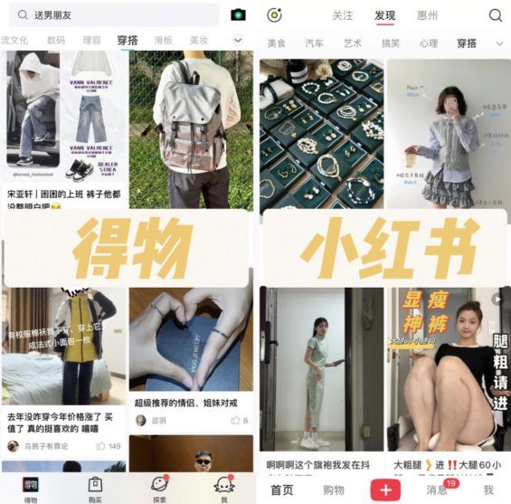 内容创作者也没有小红书卷,只要没限流,拍摄水平比买家秀好一些,都能接商单,放一个得物穿搭和小红书穿搭的对比图给你们感受下(随机截图)