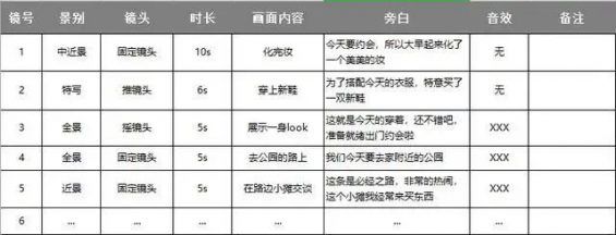 03、分镜头脚本 分镜头脚本适用于故事性强的短视频。 分镜头脚本已经将文字转换成了可以用镜头直接表现的画面,通常分镜头脚本包括画面内容、景别、摄法技巧、时间、机位、音效等。 分镜头脚本一定程度上已经是“可视化”影像了,它能帮助团队最大程度保留创作者的初衷,因此对于想要表达一定故事情节的短视频创作者不可或缺。